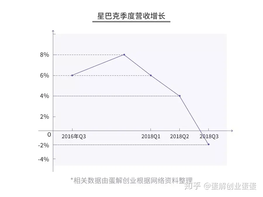 公开资料显示,2016年Q3以来,星巴克中国一直保持6%以上的高增长,部分季度甚至达到8%。但进入2018年后,增长陡转直下,2018Q1从上一季度的8%下滑到6%,Q2只有4%,Q3变成-2%,星巴克在中国增速以惊人的速度下滑。