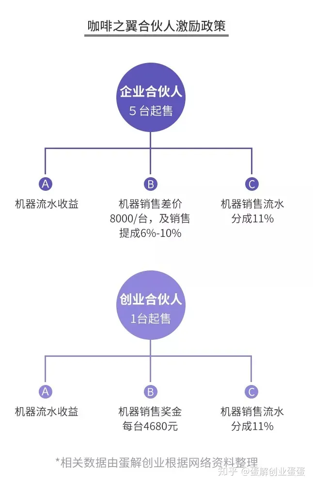 甚至,咖啡之翼还出过合伙人制度,成为企业合伙人,卖一台提成8000,销售提成6%-8%,还有11%的流水分成,公司还送50个精准客户,简单粗暴改良微商模式卖机器。